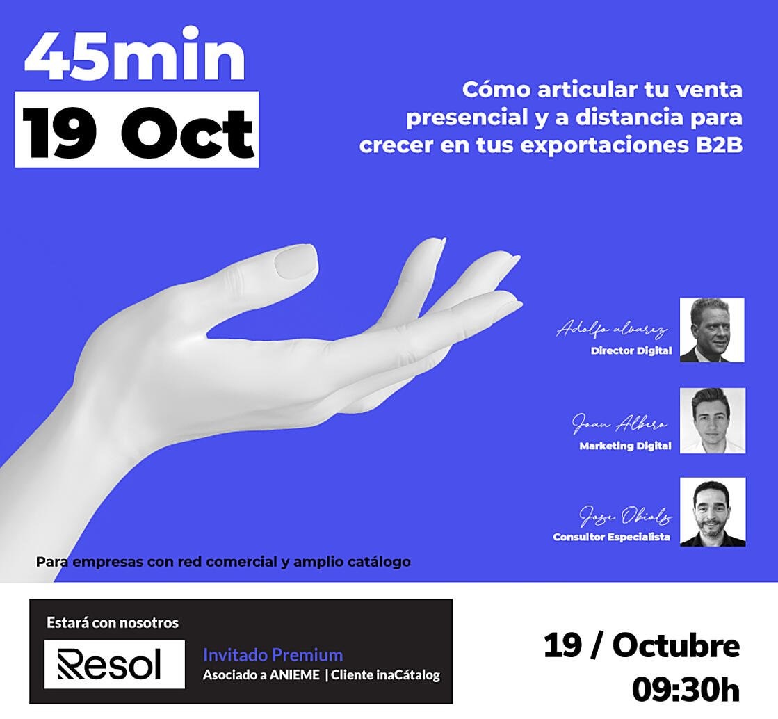 El martes 19 de octubre, conocerás como tus clientes internacionales, desde cualquier parte del mundo, pueden realizarte sus pedidos online, junto con sus clientes. También se hablará de cómo alinear a tus equipos de ventas B2B nacionales e internacionales; la simultaneidad de trabajar on y off y como se puede realizar la digitalización personalizada en tu B2B.