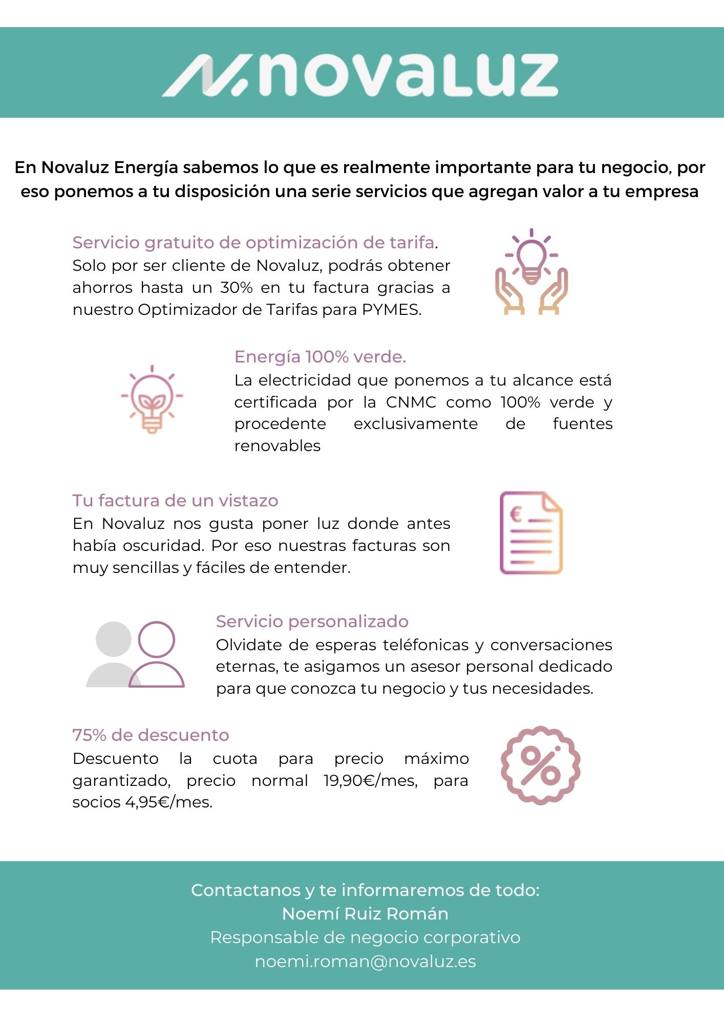 Actualmente hemos firmado un Acuerdo de colaboración con la empresa NOVALUZ, suministrador especializado en PYMES de "energía verde", procedente en el 100% de fuente energética eólicas españolas.