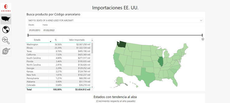Esta sencilla plataforma, ágil y muy intuitiva, te proporciona la información sobre las marcas europeas, asiáticas, etc... implantadas en EEUU, quiénes son sus importadores, en qué estado se sitúan y qué volumen de transacciones han realizado en los últimos meses. A través de diferentes filtros, puedes adecuar la información a tu interés particular.