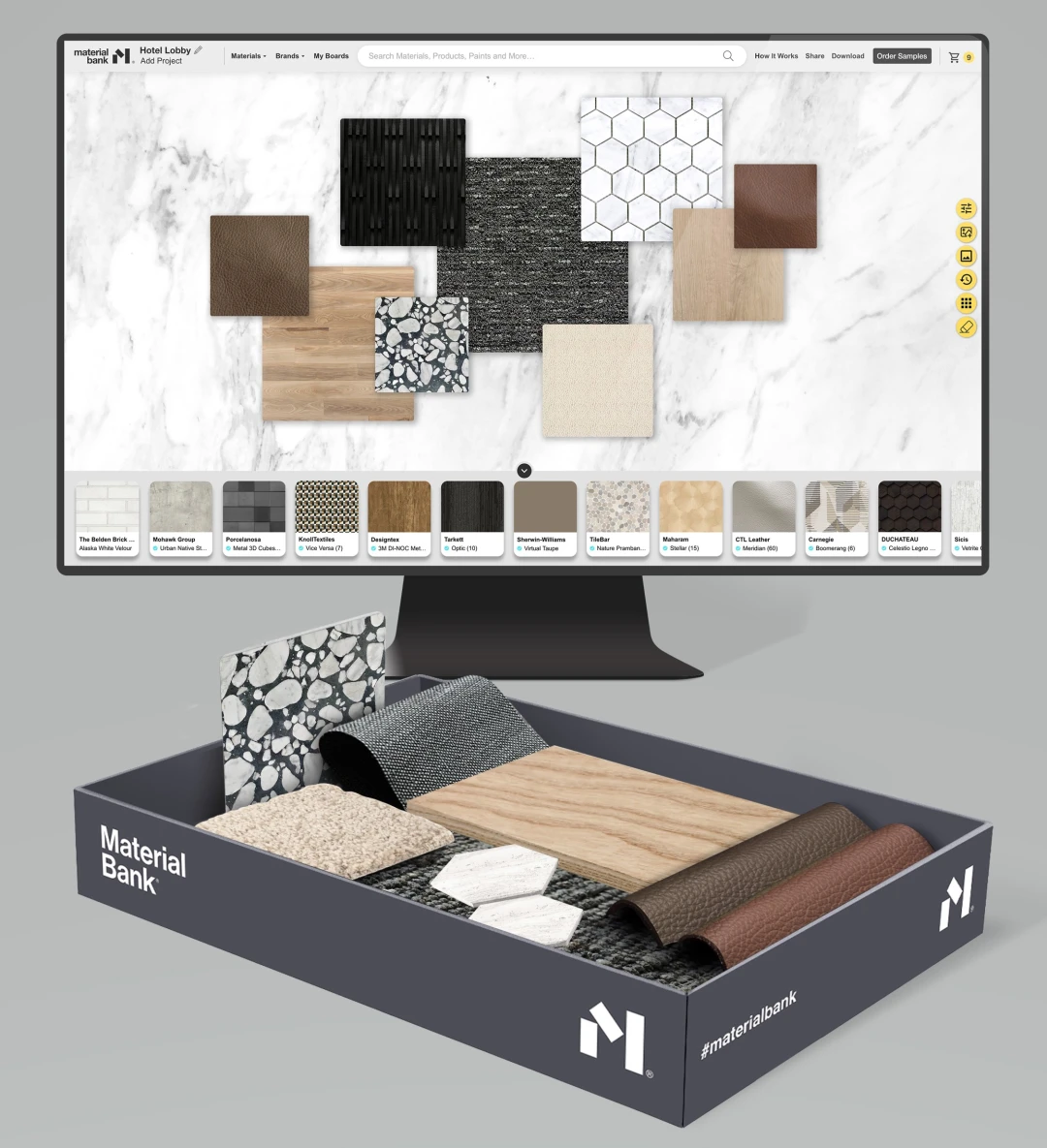 La plataforma facilita a los arquitectos y diseñadores que puedan elegir y solicitar muestras que necesitan para sus proyectos gracias al catálogo de miles de acabados de diferentes tipos de materiales (pavimentos, textiles, pinturas, acabados de madera, revestimientos de paredes, vidrio, piedra y metal, etc...) Una vez estos profesionales son aprobados, reciben las muestras seleccionadas de forma gratuita en una única caja y con un envío rápido (menos de 24 horas en grandes ciudades).