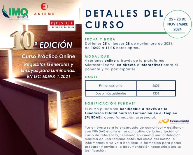 Del lunes 25 al jueves 28 de noviembre, en el horario de 15:00 a 17:15, se celebrará la 10ª edición del Curso Práctico sobre Requisitos de Normativa de Luminarias EN IEC 60598-1:2021,