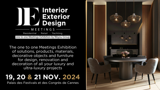 Te presentamos la primera edición de Interior & Exterior Design Meetings, evento B2B que se celebra del 19 al 21 noviembre 2024 en el Palais des Festivals et des Congrès de Cannes, Francia. Se trata de un evento con agenda de reuniones y exposición de productos, materiales, objetos de decoración y mobiliario para proyectos residenciales, comerciales y de yates de lujo.