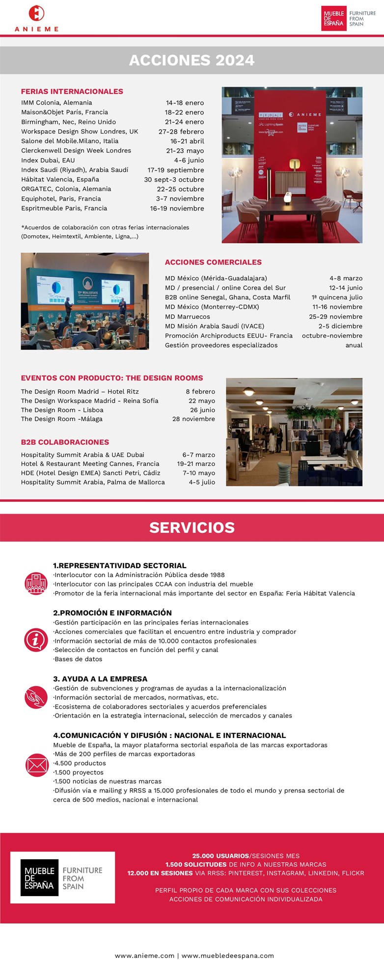 El año avanza rápido y ya contamos con fechas para prácticamente todas las Acciones y Servicios que forman parte del Plan de Promoción del 2024. Aquí te las mostramos todas juntas, confiando en que sean de tu agrado y apoyo en el intenso proceso de la internacionalización. Iremos convocando una a una todas las acciones y si tienes interés por alguna en particular, el equipo entero de ANIEME estamos a tu disposición. ¡Contamos contigo!