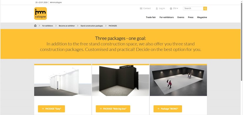 Como cada año, la imm Colonia inicia el “curso ferial” del sector y es la cita alemana más relevante del año. La asociación del comercio de mueble BVMD aprovechará la cita para celebrar en Colonia su cumbre anual. Para impulsar su nueva orientación, la feria ha ajustado sus tarifas y ofrece soluciones “llave en mano” para facilitar la participación de nuevos expositores y de aquellos que quieran una solución ágil y personalizada. Desde 100 €/ m2 podrás estar presente en la imm Colonia. Pincha aquí para conocer los detalles sobre varias opciones de stand: Stand construction packages | imm cologne
