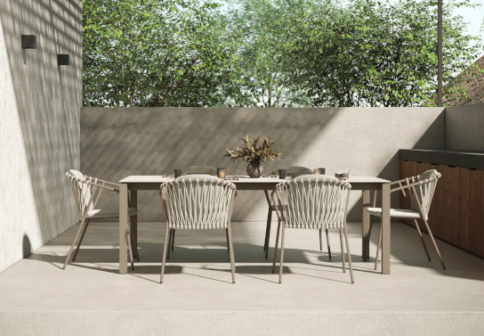 BAGA es una colección de sillas hecha completamente de acero inoxidable. Su asiento, disponible en una o dos piezas, es extraíble, relleno de espuma de poliuretano permeable al agua (Sensación seca) y fibra de poliéster. El respaldo está hecho de cuerda de polipropileno disponible en varios colores.