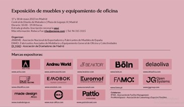 Este evento con el sector de mobiliario de oficina es el segundo que se organiza (edición del año 2022 aquí). Se trata pues, de seguir compartiendo con el sector Oficina, que contó con el respaldo de numerosos fabricantes y asociaciones, tales como FAMO (Asociación de Fabricantes de Mueble de Oficina), DI_MAD (Asociación de Diseñadores de Madrid).y ANIEME (Asociación Nacional de fabricantes mueble y exportadores).