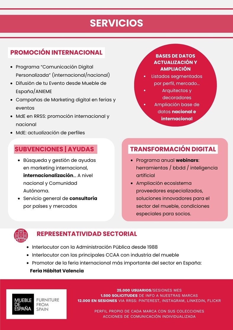 A nivel de servicios, seguimos trabajando de forma especial en el crecimiento y afianzamiento de la marca Mueble de España y en la interlocución con los organismos pertinentes para conseguir los mayores recursos posibles para nuestro sector.
