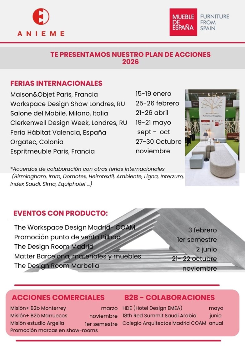 En ANIEME ya tenemos grandes avances en cuanto a la planificación del 2026. Queremos compartir con nuestras empresas las acciones y servicios que estamos organizando para los fabricantes de muebles y hábitat de toda España, tras recopilar sus opiniones y explorar diversos mercados, ferias y actividades desarrolladas en 2025. Todas estas propuestas son dinámicas y pueden sufrir modificaciones conforme pasen los meses, pero os las mostramos ya para que podáis planificar y sacar el máximo partido de ellas. Durante el año iremos comunicando actualizaciones y posibles incorporaciones y cierres de fechas pendientes.